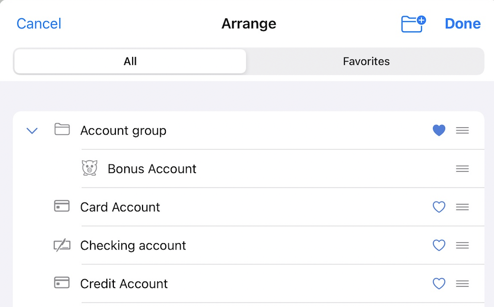 Once a group has been created, you can use drag and drop to move accounts in and out of it. Press and hold your finger onto an account name for a moment before sliding your finger to drag the account. Click the small disclosure triangle next to the group's icon to hide or display the accounts within it.