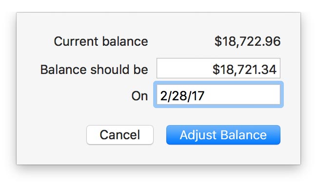Sometimes, after you have finished reconciling the transactions in Banktivity with those on your printed statement, a discrepancy may still exist between your reconciled sum and the statement total. If you check and double-check your records, and just can't seem to find a transaction that was overlooked, you can enter a balance adjustment to sync up your records. Click "Transactions" above the statement list to view the account register, then choose Account > Adjust Balance. The following sheet will appear: