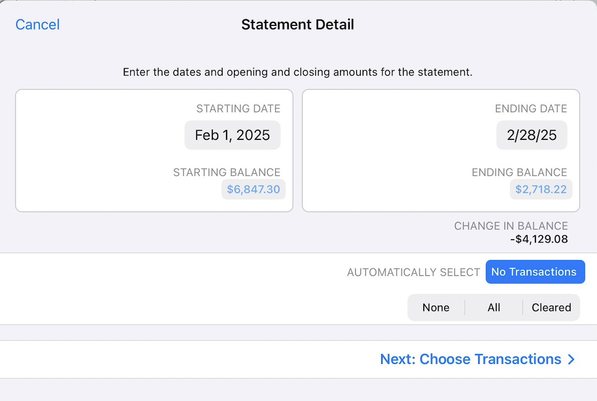 - Ending date: Enter the ending date for the statement period (as indicated on the printed statement). By default, Banktivity shows the last day of the month indicated by the default starting date.