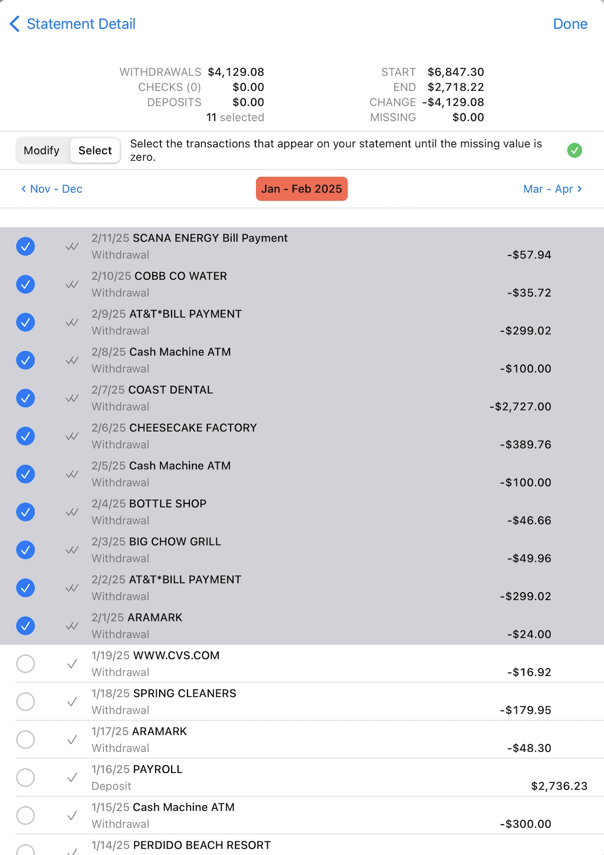 You can add, edit, and delete transactions while reconciling a statement by toggling between Modify and Select at the top of the statement. To add one, click Plus button on the top right of the statement. To edit or delete a transaction, swipe left on a transaction in the list and choose edit or delete. All changes you make to transactions while reconciling affect your account register as well.