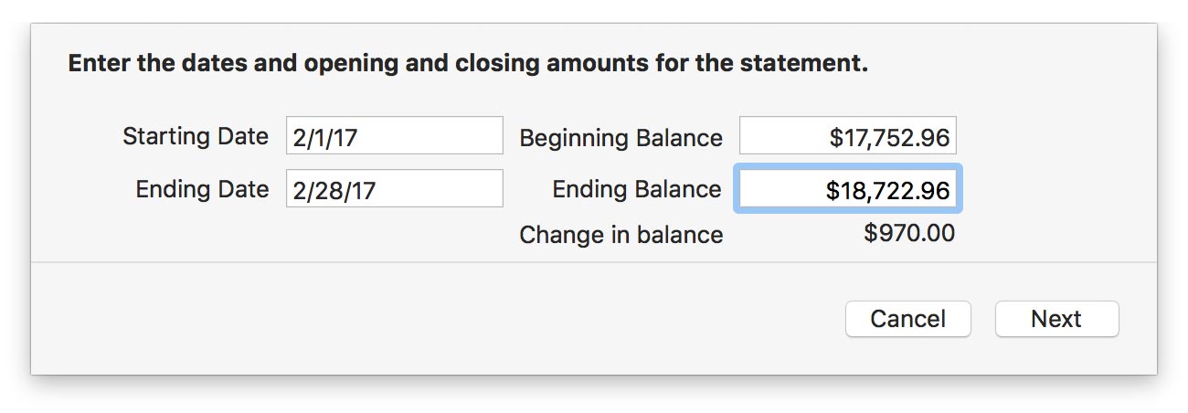 - Starting balance: Enter the account's balance as of the beginning of the statement period (as indicated on the printed statement). By default, Banktivity shows the ending balance from the previous statement. If you are reconciling an account for the first time, set the starting balance to 0.00 in order to accommodate the account's initial balance adjustment. For credit cards and other liabilities, be sure to enter the balance as a negative number.