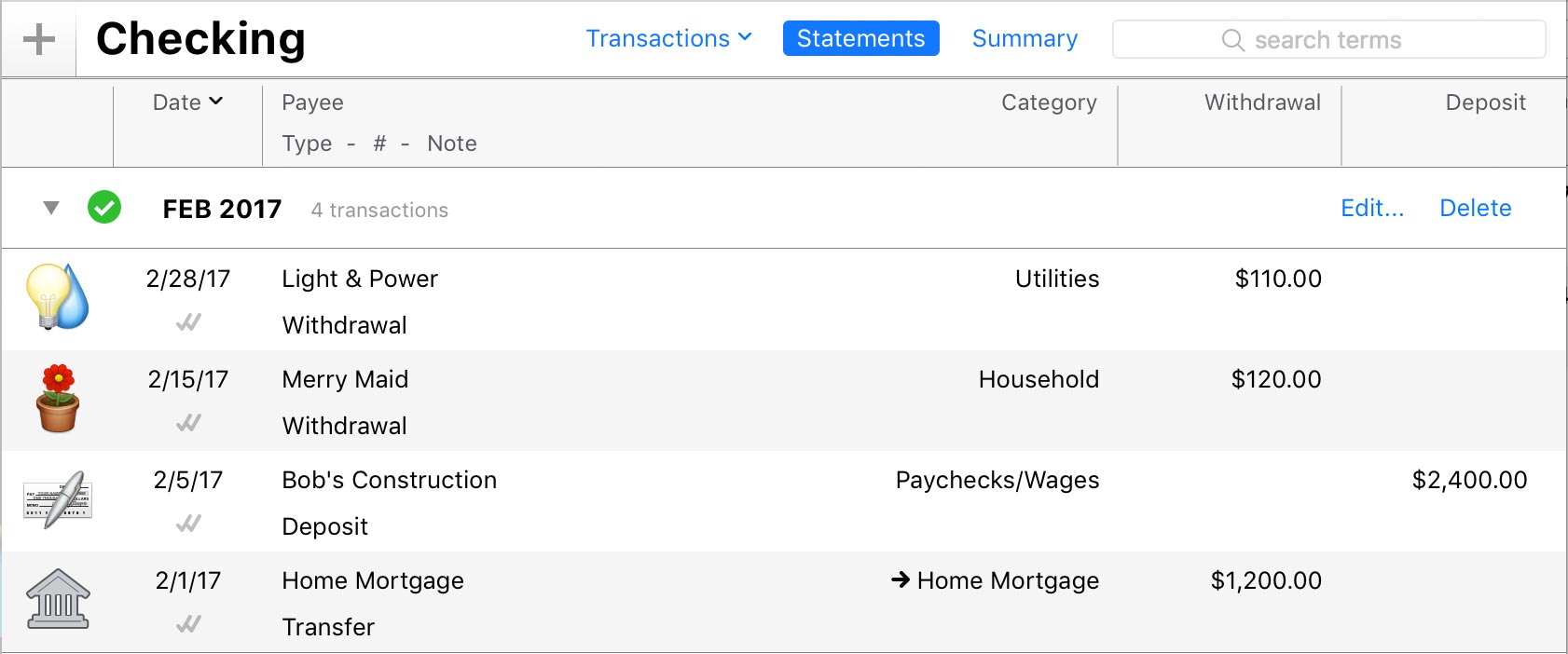 Click "Statements" above the account register to view a list of statements in the account and the transactions that belong to them.