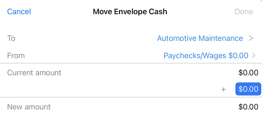 To move cash from one envelope to another, tap on the amount under the envelope column next to the category you would like to move cash to. A sheet will appear to let you specify which envelopes to move cash to and from (including categories that are not displayed on the budget report), and how much cash you want to move. Click "Done" to record the transfer.