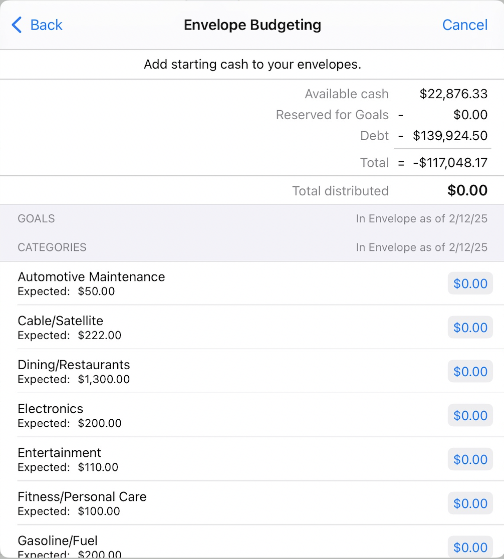 Enter the amount of cash you currently have set aside for each category. If you are just getting started with envelope budgeting, your envelopes will most likely start at 0, and you can fill them the next time you get paid. If you were already paid during the current budget period (and didn't spend any of that money yet), enter the amount you were paid in the appropriate income envelope.