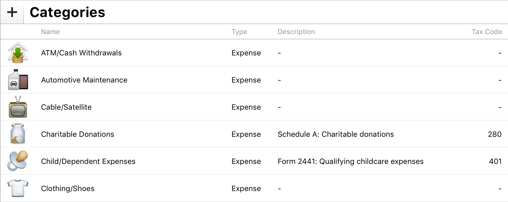 - Tax Code: If the category is associated with a particular tax code, enter the number of the code in this field to help you remember it. Click the help (?) button to view a list of US tax codes.