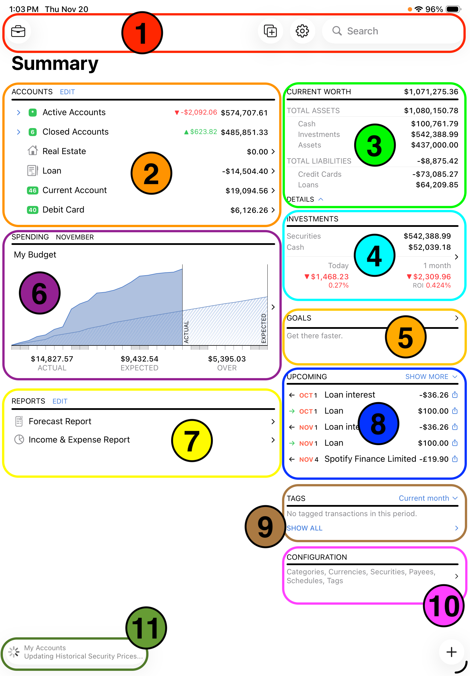 - Current Worth: This section of the summary will give you a snapshot of your total worth and a breakdown of which assets and liabilities make up that total current worth.