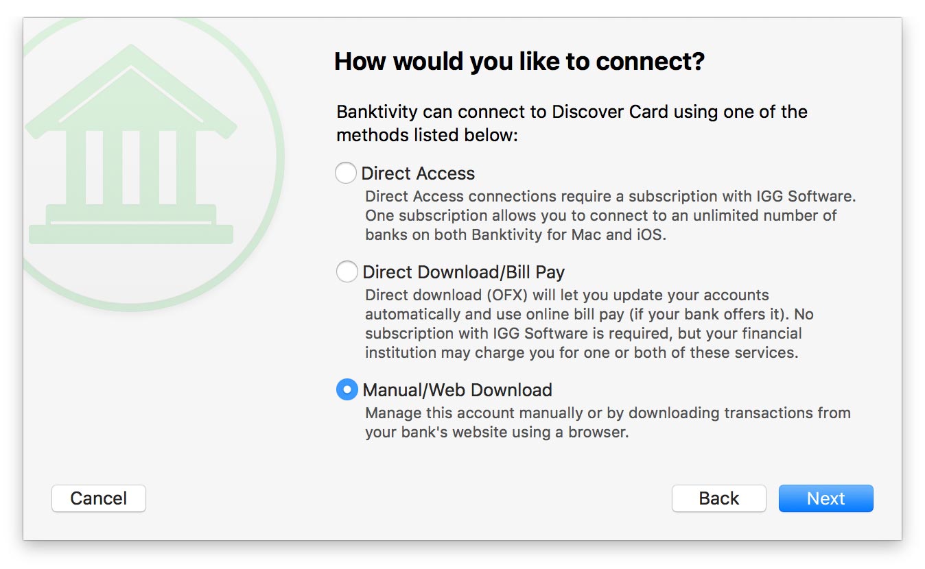 Once you choose an institution, Banktivity will ask the servers at IGG Software what types of connections are currently available for your selection. Select "Manual/Web Download" and click "Next." The next screen will offer you a choice of configuring web download or setting up the account manually. Click "Web Download" to continue.