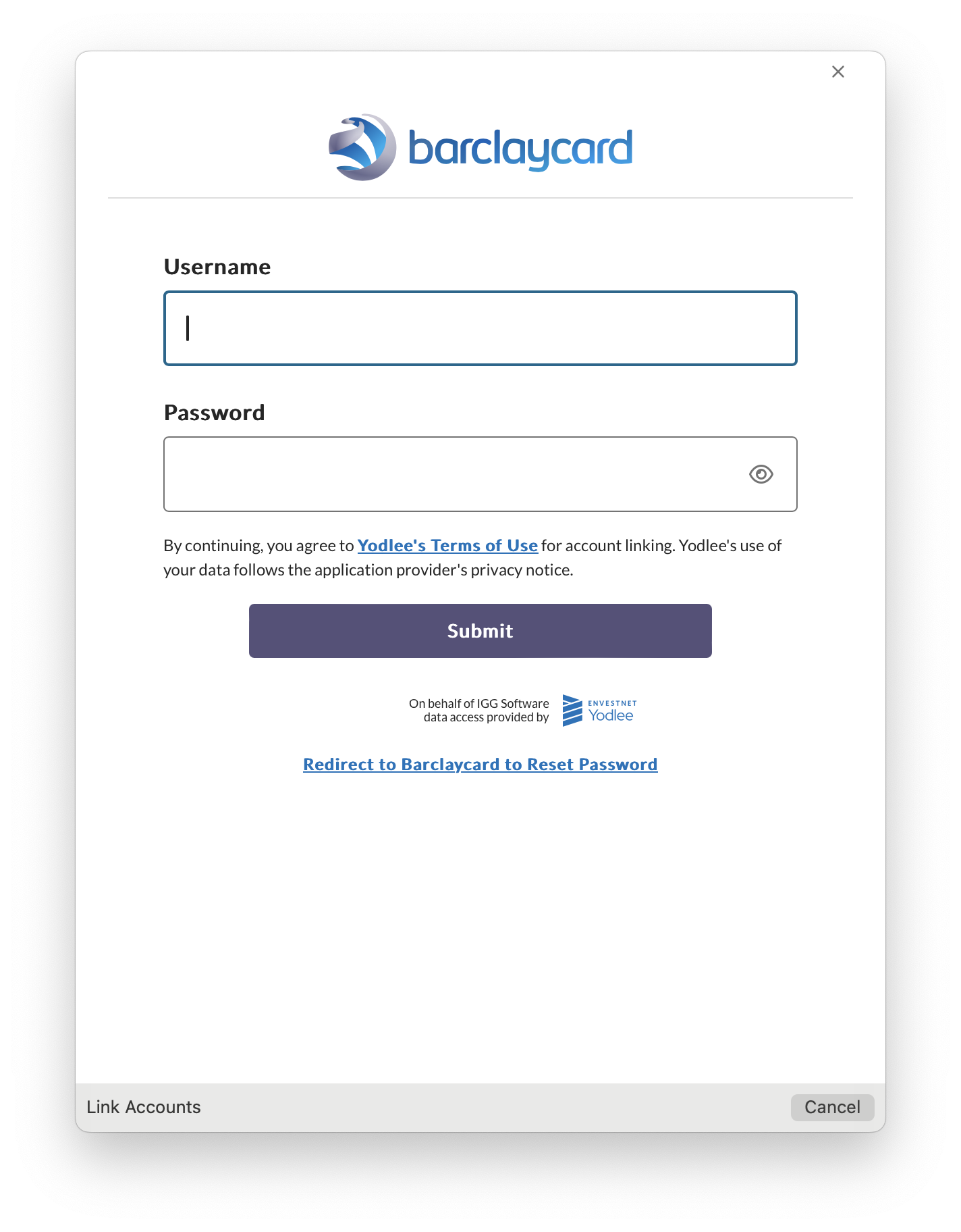 If you are not already signed in with your Banktivity ID, you will be prompted to enter your login and password. Once you have done so, click "Submit" to continue. Next, Banktivity will prompt you to enter the login details for your financial institution: