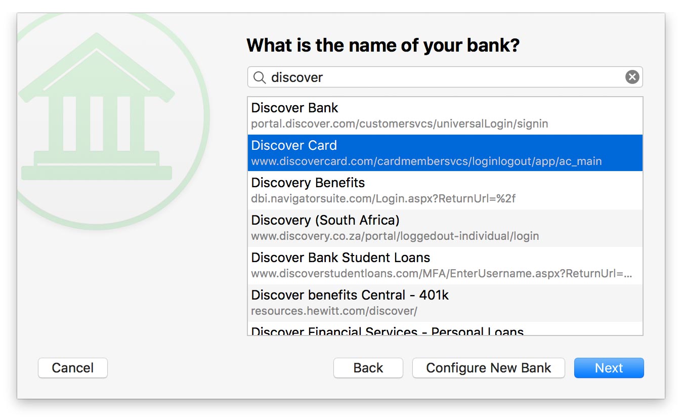 An internet connection is required to use direct download and bill pay. If you are not connected to the internet, feel free to set up your accounts manually. You can always configure online access for them at a later date.