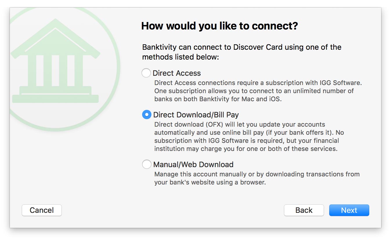 Also known as OFX, Banktivity's direct download feature provides one-click transaction updates and support for online bill pay. IGG Software does not charge for direct download or bill pay, but many institutions require a separate enrollment and charge a monthly fee for these services. Fewer institutions support this download method than Direct Access.