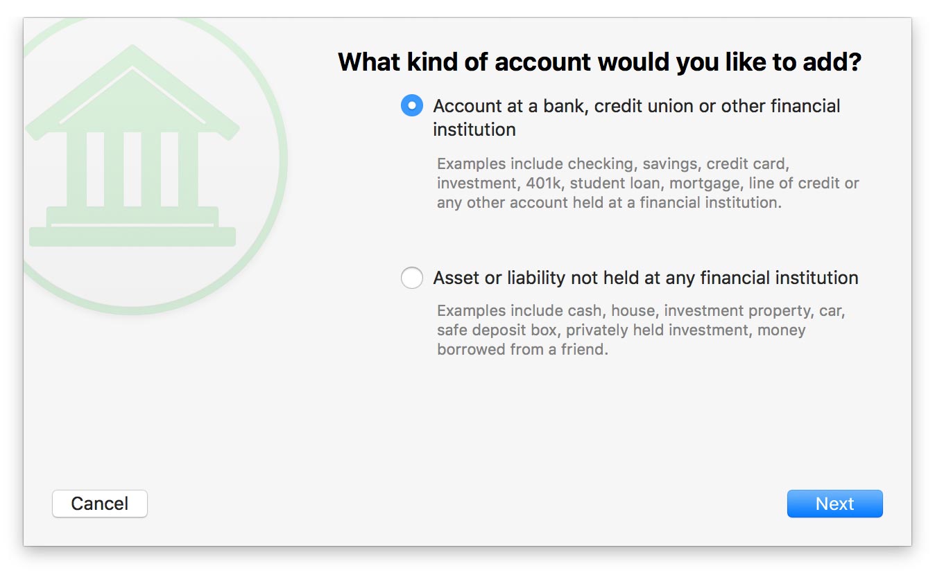 On this screen, you are asked to choose whether or not the account you are setting up is held at a financial institution. To use direct download, select the first option and click "Next" to proceed.