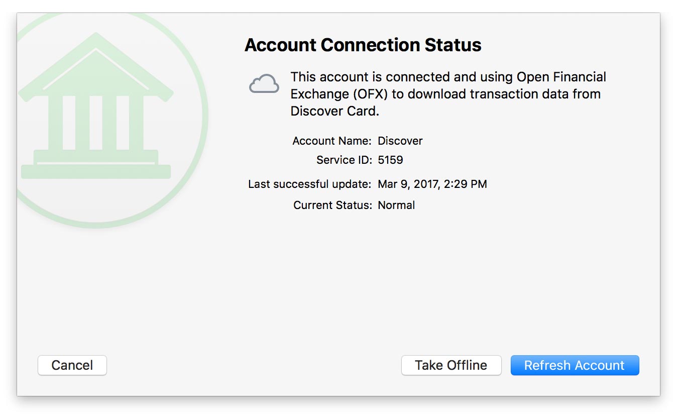 If there is a problem with the online connection, this screen will show details about the problem and how to resolve it. To refresh the connection to an online account, click "Refresh Account." If the account login details have changed, you will be prompted to enter them again.