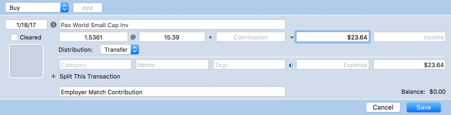 A running total of the account's cash value, showing each transaction's effect on the total. This field is automatically calculated by Banktivity and cannot be edited. Note that this balance represents cash held in your brokerage account only, and it is common for the balance of these accounts to be 0 if you are using the "Transfer" distribution type (see below). The market value of shares you own is not included – to see this information, view the Portfolio.