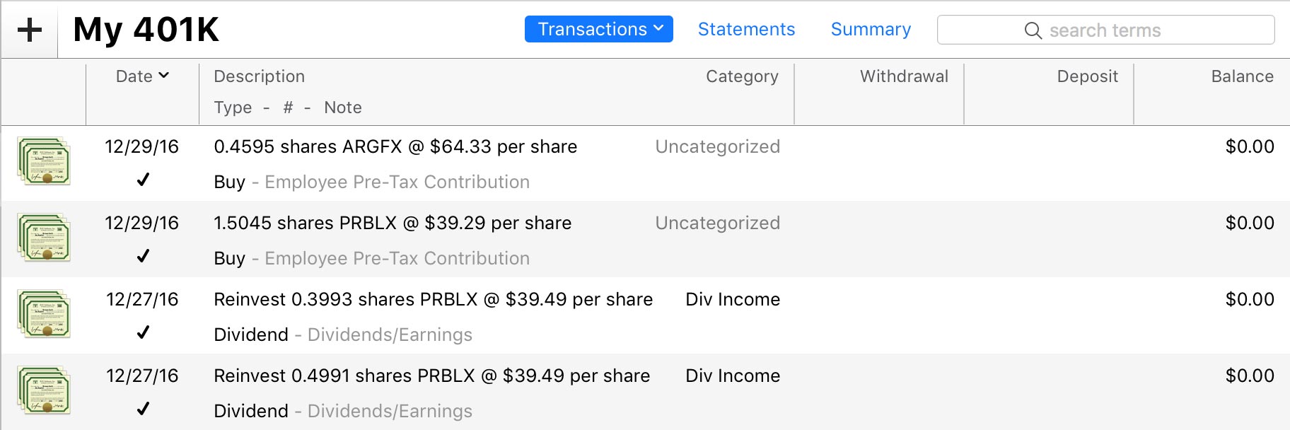 To track your investment activity in Banktivity, you must first set up an investment or 401k account and then add transactions to the account as you buy and sell securities. In Banktivity, investment accounts are set up and maintained just like banking accounts, except that they allow transaction types that pertain to securities. When you select an investment account in the sidebar, the account register will appear to the right so that you can manage the transactions in the account. You will notice that the register for an investment account shows different information than it does for a banking account: