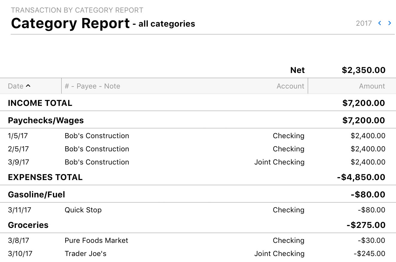 The Category report type is used to quickly view details of all transactions assigned to one or more categories within a specific period of time. It is a simple way to view totals for your categories while seeing the details of the transactions that make up those totals.