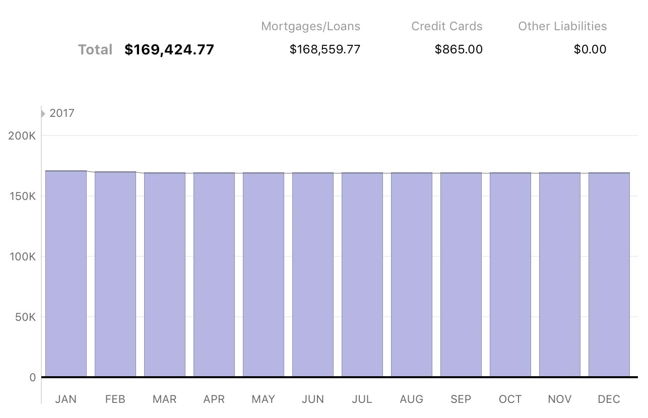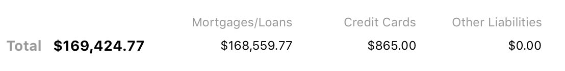 At the top of the report are figures that summarize your debt. On the left is your total debt, which is the sum of all loan, credit card, line of credit, and liability account balances. To the right are subtotals for different account types: "Mortgages/Loans" represents your loan accounts, "Credit Cards" includes credit card and line of credit accounts, and "Other Liabilities" covers liability accounts.