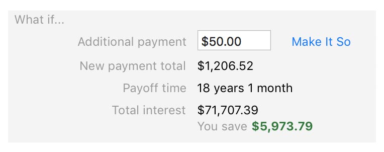 If you find a payment plan you like, and want to adjust your loan settings to include the additional payment, simply click "Make It So." Banktivity will automatically make the necessary changes to your loan and upcoming scheduled payments.