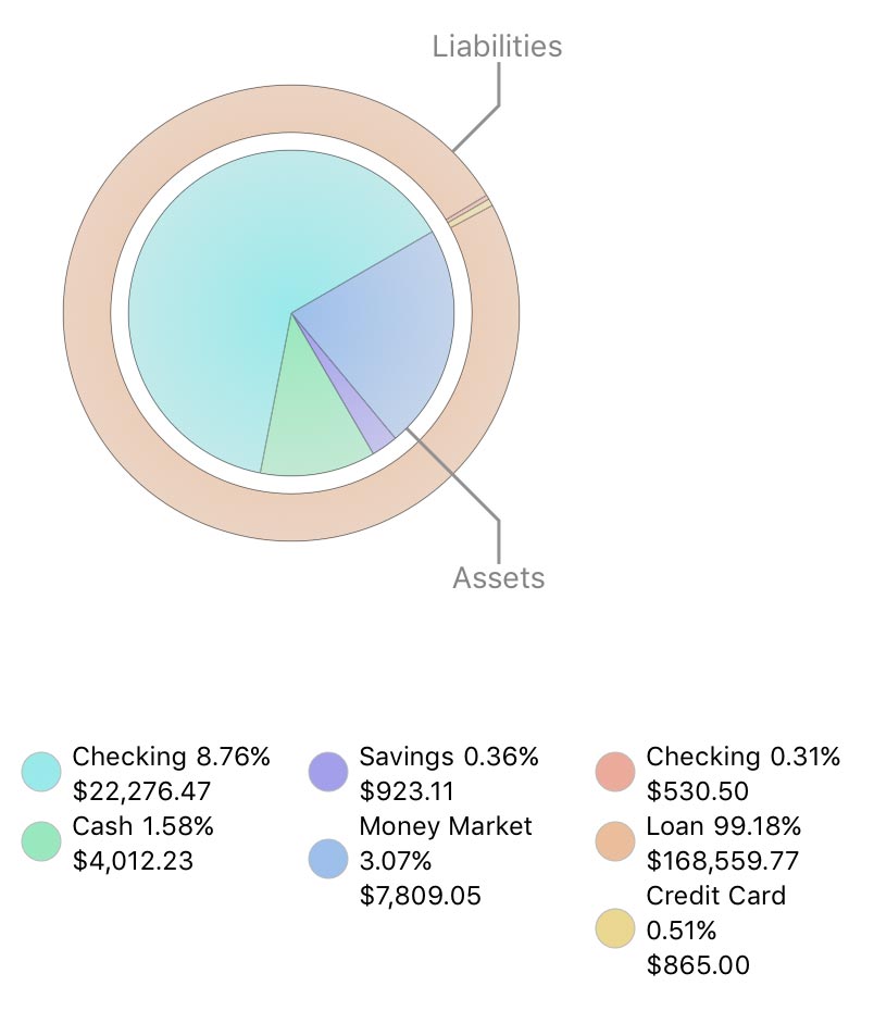 This chart depicts your assets and liabilities at a fixed point in time (the end date of the report). Assets (accounts with positive balances) are shown in the inner circle; liabilities (accounts with negative balances) are in the outer ring. Each pie slice represents the total value of the accounts of a particular type. The slices are drawn proportionally so that you can see which types of accounts are worth more.