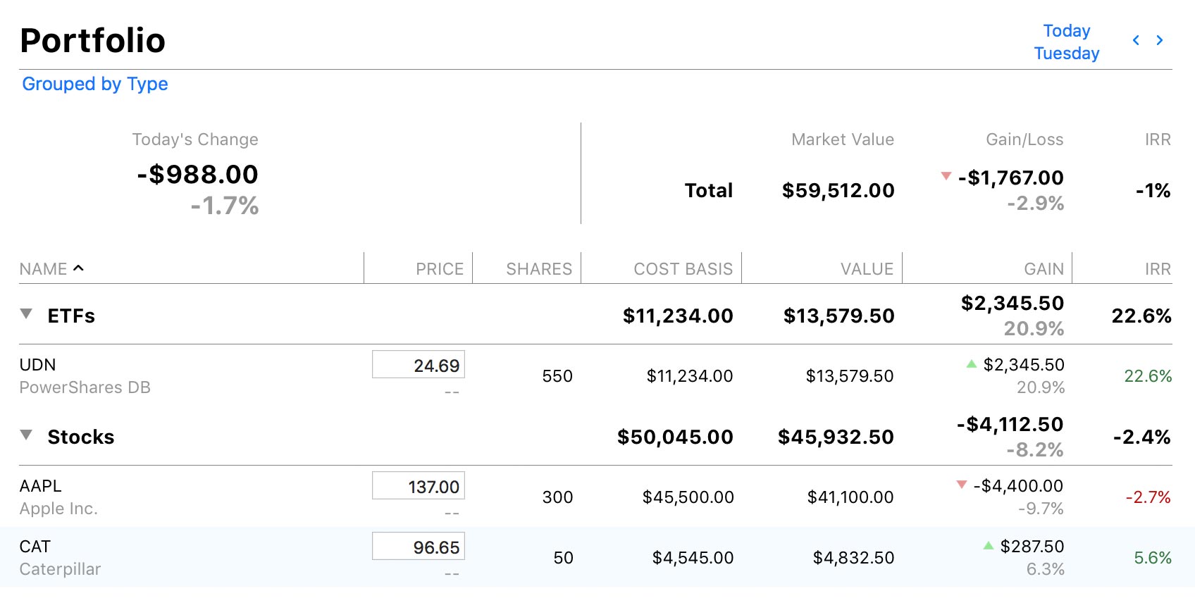 Each security shows its name and symbol followed by its current price, change in value since the close of business on the previous day, number of shares currently held, cost basis (amount paid for the shares), estimated market value, unrealized gain or loss relative to the cost basis (expressed both as an amount and as a percentage), and internal rate of return. You can change the security price directly by selecting it and typing in a new amount; the change will also be recorded in the security's price history chart.