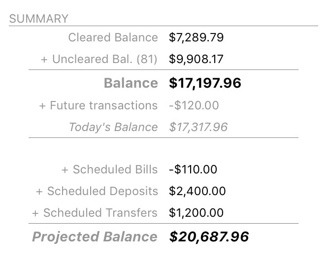 The account summary to the right of the bar chart displays the total value of cleared and uncleared transactions as well as the current account balance. Below that are the total values of upcoming scheduled bills, deposits, and transfers (based on the date range specified in the next section), along with the account's projected balance after the schedules have been posted.