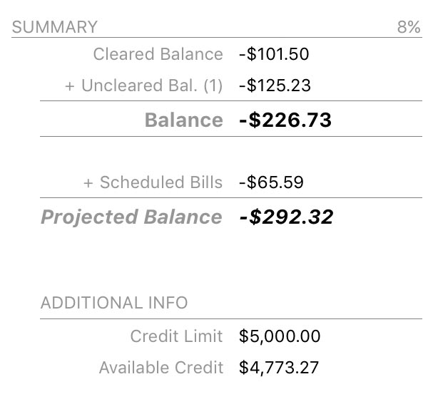 The account summary to the right of the bar chart displays the total value of cleared and uncleared transactions. Below that are the total values of upcoming scheduled bills, deposits, and transfers (based on the date range specified in the next section), along with the account's projected balance after the schedules have been posted. Under "Additional Info" is shown your credit limit (which you can edit by double-clicking the account in the sidebar) and your available credit (equal to the difference between the credit limit and the account balance). The percent value at the top right is the card's interest rate, which you can edit by double-clicking the account in the sidebar.
