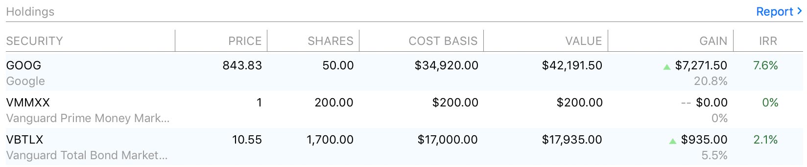 Click on any security to view a Security Detail report for that item, or click "Report" at the top right to view an Investment Summary report for the account.