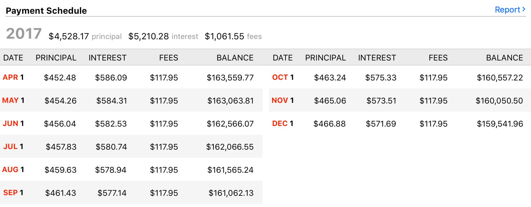 At the top of this report is an area chart depicting all remaining loan payments. Time is plotted along the x axis while the y axis is used to show amortization. Each payment is divided into principal (light green), interest (red), fees (orange), and additional principal (dark green). The values shown on the y axis indicate the amount of each of these parts of the next payment that is due, along with the total payment amount. Shown at the top of the chart are the total principal, interest, and fees that remain to be paid over the life of the loan.