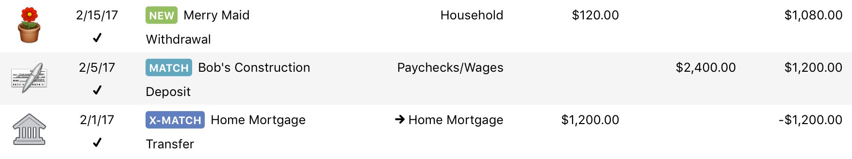 - Match: The transaction was imported within the last 24 hours and matched a transaction that was previously recorded in the account. For more information about how Banktivity matches transactions during an import, see Reviewing Imported Transactions.