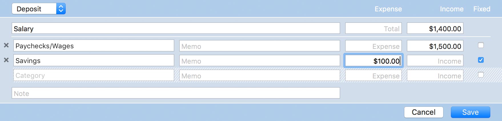 Transaction templates may also have split items associated with them; these can be viewed by clicking the "split" button. When editing a template, split balancing is handled differently than when editing regular split transactions. Instead of the split balancer icon, each split item has a "Fixed" checkbox at its right side. Checking this box will designate the item's amount as fixed: it will not change if you adjust the overall transaction amount, whereas unchecked items will fluctuate depending on the overall transaction amount. On templates, the transaction total is always variable and cannot be fixed. A couple of examples will help to illustrate this feature: