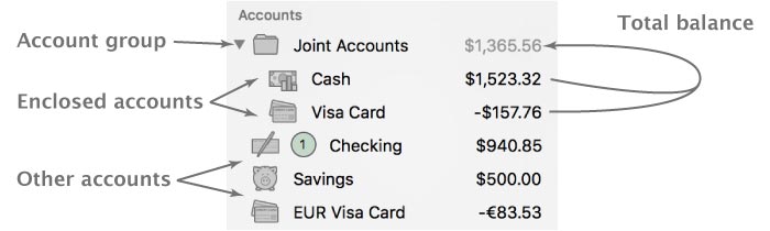 The amount displayed next to a group's name represents the total balance of all the accounts within the group. Selecting the account group itself will display a list of the accounts within the group, along with their balances, in the current workspace. Click on an account to view its transaction register.