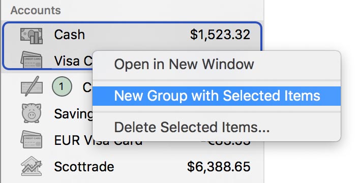 Once a group has been created, you can use drag and drop to move accounts in and out of it. Click the small disclosure triangle next to the group's icon to hide or display the accounts within it.