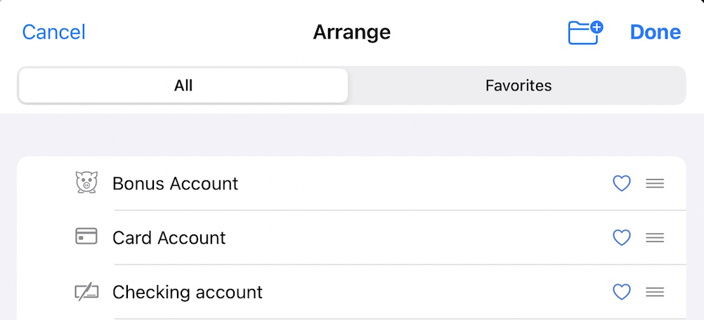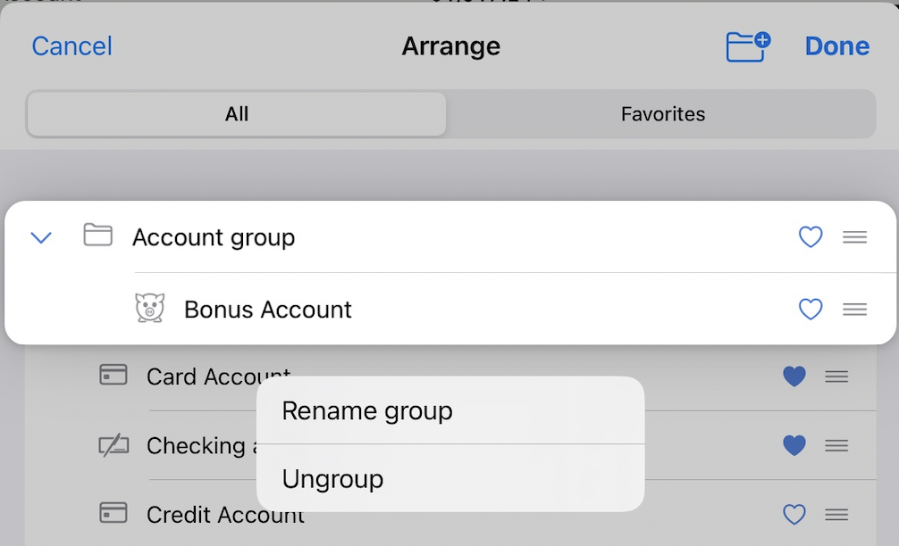 Once a group has been created, you can use drag and drop to move accounts in and out of it. Press and hold your finger onto an account name for a moment before sliding your finger to drag the account. Click the small disclosure triangle next to the group's icon to hide or display the accounts within it.