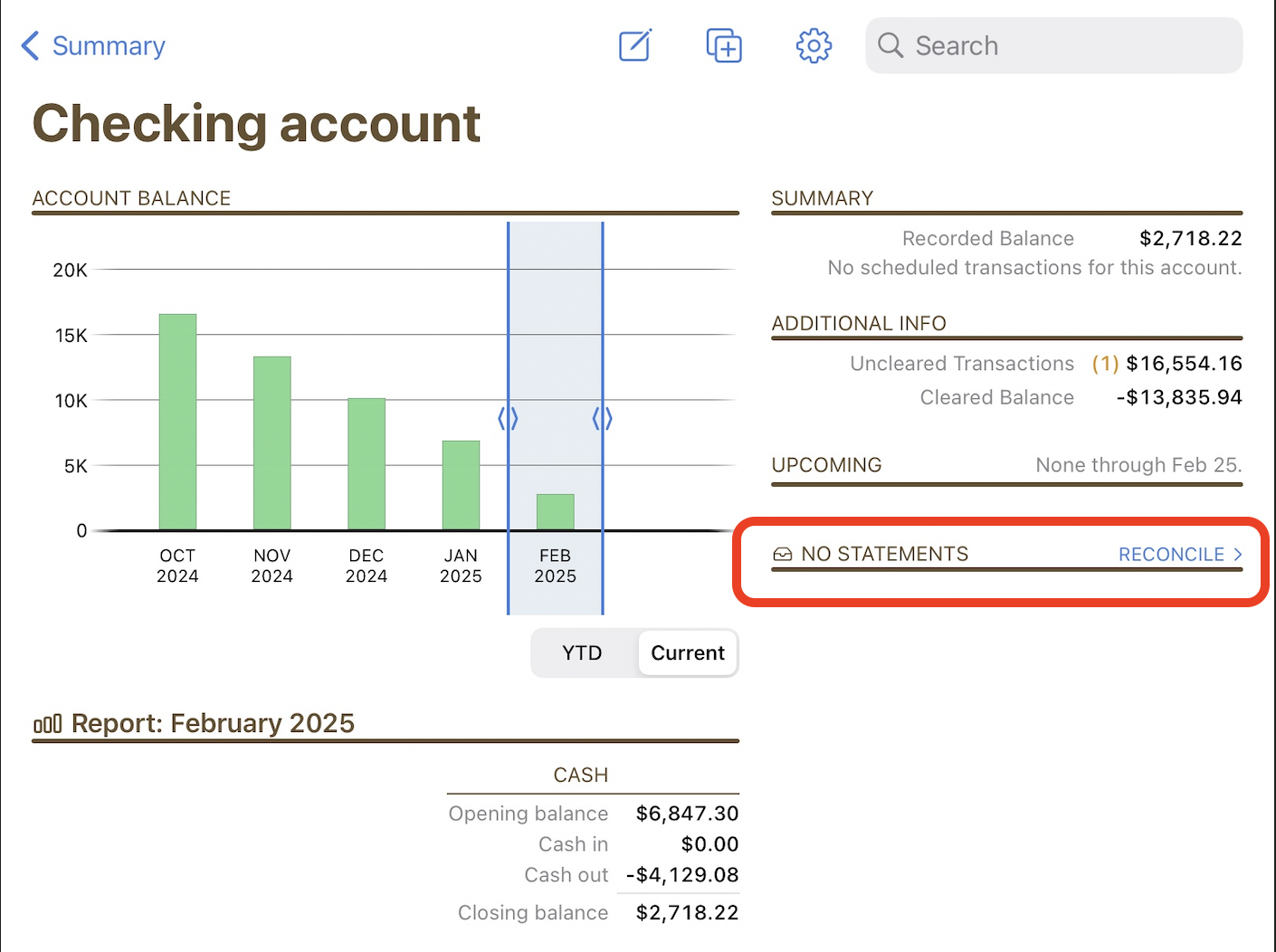 When you receive a statement from your financial institution, select the account you want to reconcile, then click the "Reconcile" button on the navigation bar. In the sheet that appears, configure the details of the new statement: