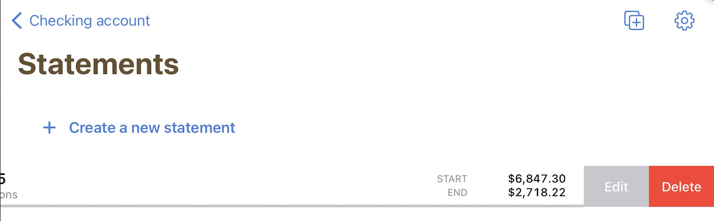 If you need to make changes to an existing statement or delete it, view the statement list and swipe left on a statement. This will reveal the "Edit" and "Delete" options next to the name of the statement. You can choose to delete it or you can choose to edit it and just like when you first created the statement, you can set the starting and ending dates and balances, then choose which transactions belong on the statement.