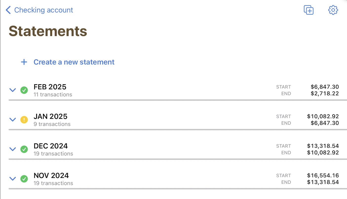 If you need to make changes to an existing statement, view the statement list, then click "Edit" next to the name of the statement you want to modify. Just like when you first created the statement, you can set the starting and ending dates and balances, then choose which transactions belong on the statement.
