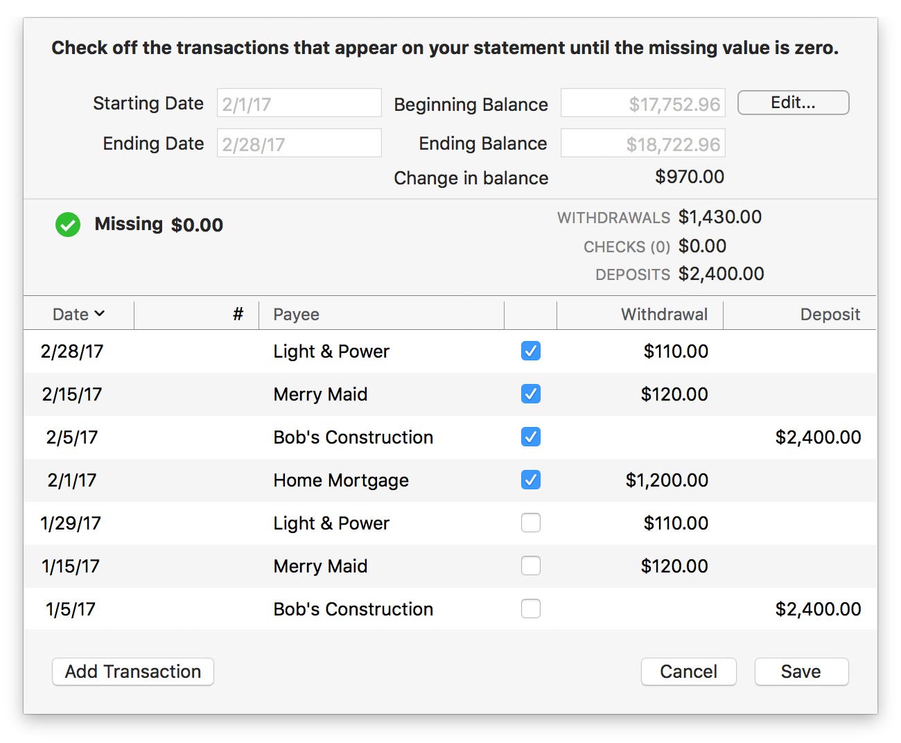 You can add, edit, and delete transactions while reconciling a statement. To add one, click "Add Transaction." To edit, double-click a transaction in the list. To delete, select a transaction and press "Delete" on your keyboard. All changes you make to transactions while reconciling affect your account register as well.