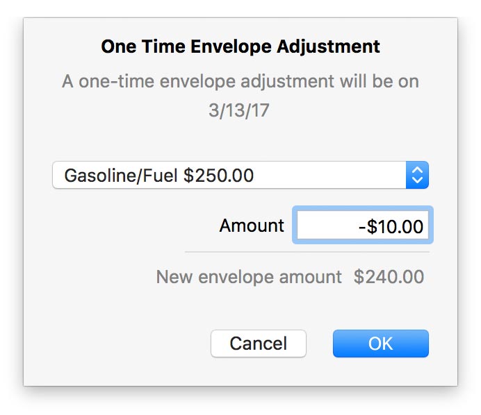 If you adjust an envelope balance while viewing a time period in the past, be aware that the change will affect your envelope cash from that point forward. The adjustment will be recorded on the last date of the period, and all budget amounts after that date will be affected by the change. Balances cannot be adjusted while viewing time periods in the future.