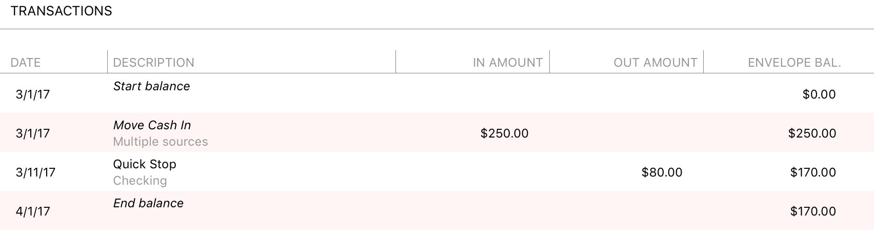 Since the transactions in your accounts automatically adjust the cash in your envelopes, make an extra effort to keep accurate records! Making changes to transactions in the past can affect your envelope cash flow in ways you might not expect.