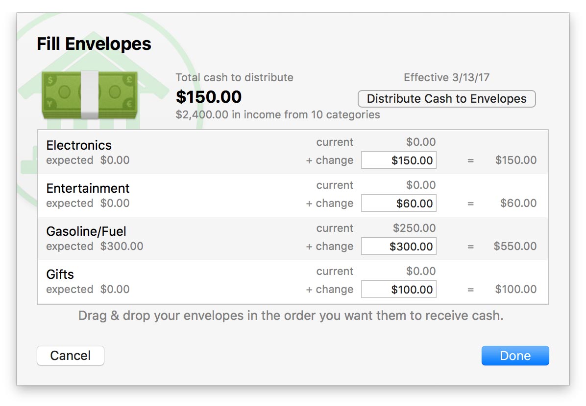 If there is enough cash to go around, Banktivity will automatically add to each envelope the amount required to cover this month's expenses. If there is not enough cash to fill all of your envelopes, Banktivity will work its way down the list until it runs out of cash. You can drag and drop items in the list to prioritize them however you like, and you can always adjust the amounts after Banktivity fills them in. If there is cash left over after all envelopes have been refilled, you can manually allocate it as you see fit, or you can leave it in your income envelopes to be distributed later. Cash is distributed from your income envelopes in the order they appear on the budget report. After you are done allocating cash, click "Done" to record the transfers.