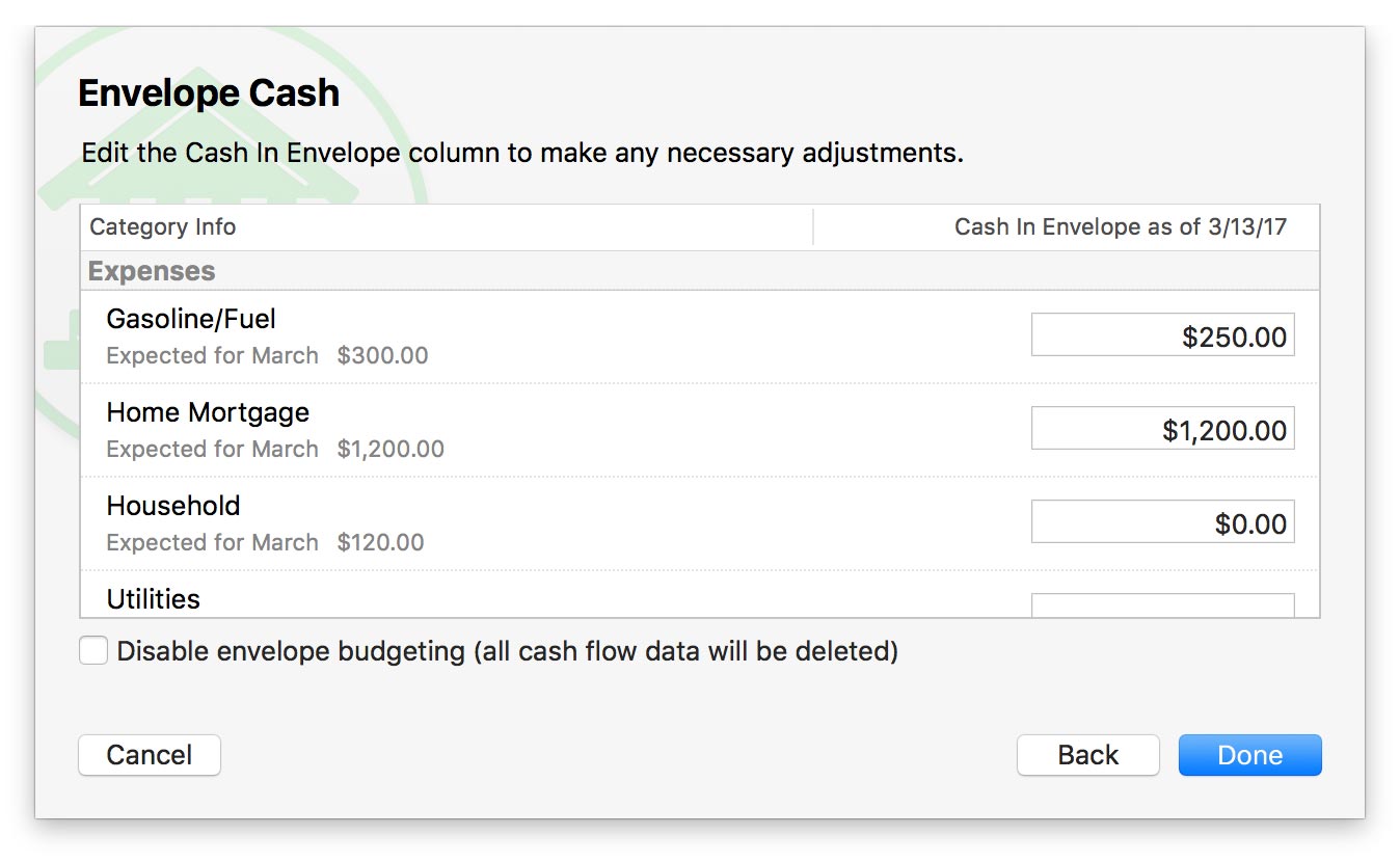 If you have been using envelopes in real life to manage your money, enter the amount of cash you currently have in each envelope as the starting cash for Banktivity's envelopes. Scroll to the bottom of the category list when you are all set and choose "Done with Envelopes"