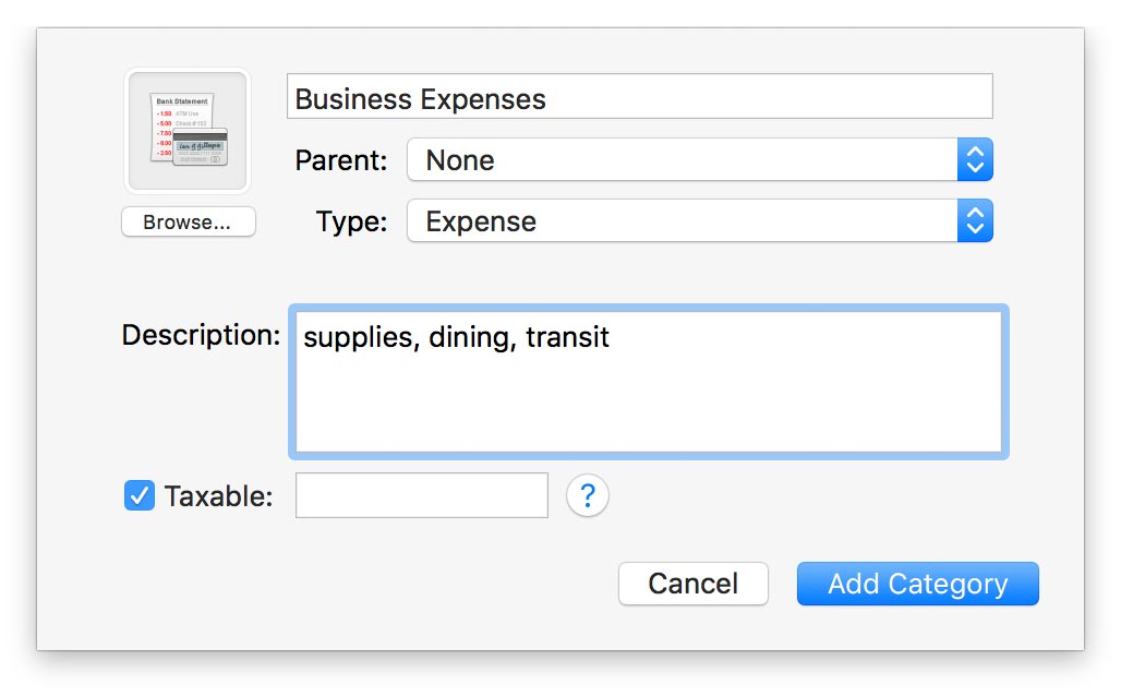 - Image: Category images appear in the account register next to transactions they are assigned to. To add an image to a category, click the "Browse" button and choose one of the available images. To use a custom image, drag and drop an image file from the Finder onto the image box, or click to select the category's image box and choose Edit > Paste to insert an image from the clipboard. To remove the image, select the image box and press Delete on your keyboard.