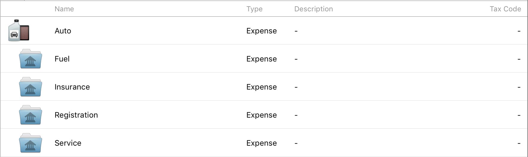 Say, for example, that you have a category for auto expenses named "Auto". You want to track all of your car-related expenses under this category, but what if you also want to be able to track how much you spend on repairs alone, or gas? Banktivity makes it easy to create sub-categories, so that you can categorize both "Service" and "Fuel" under "Auto". Using reports, you can then see at a glance how much you spent on repairs alone, or how much your car is costing you in total:
