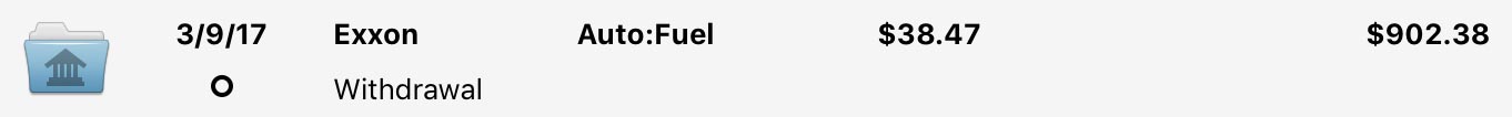 When you assign a sub-category to a transaction in one of your accounts, the transaction will display both the main category and its sub-category, separated by a colon. To illustrate, say that you assign the above-mentioned "Fuel" sub-category to a transaction. In the account register, the transaction will then show "Auto:Fuel" in its Category field: