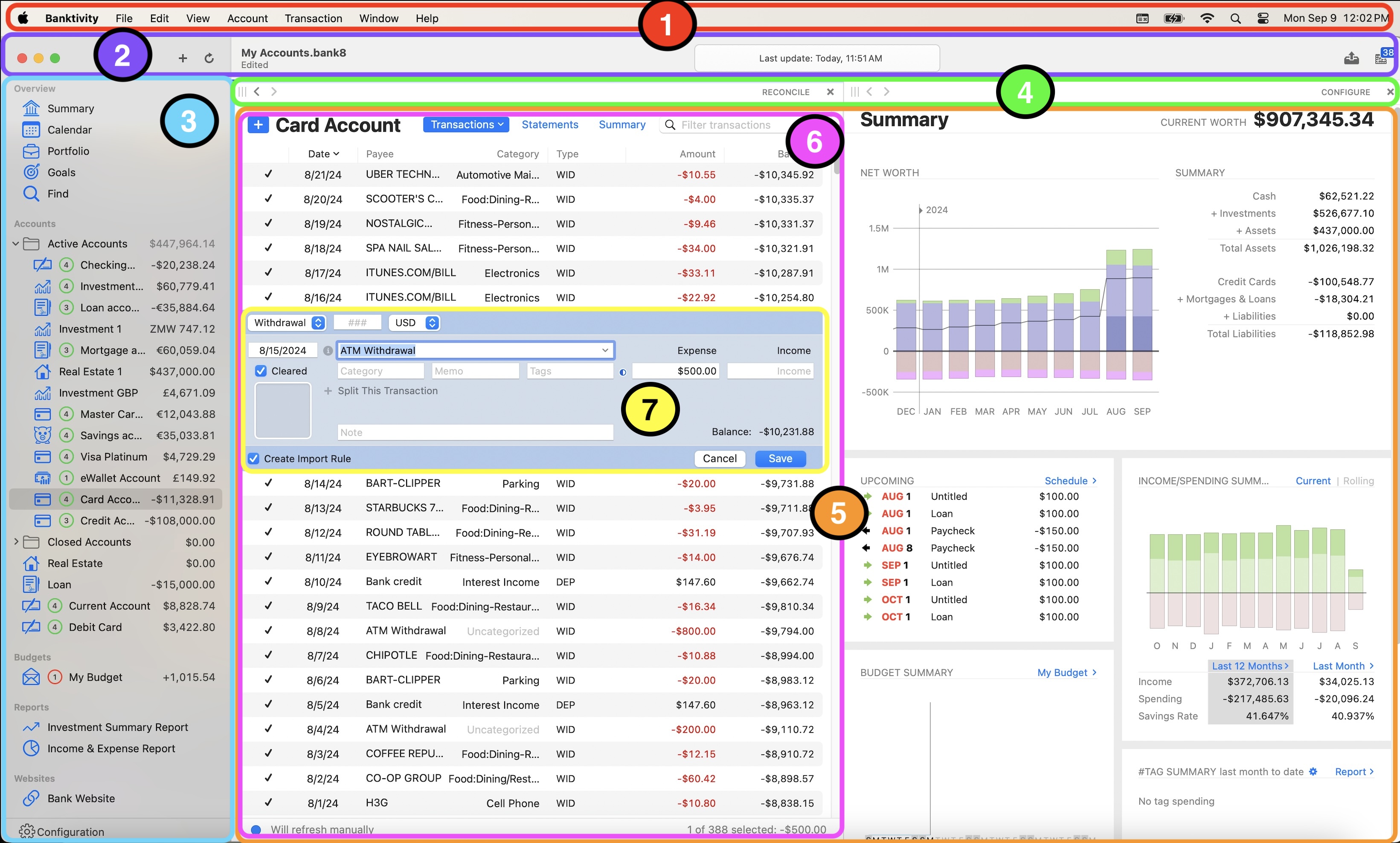 - Menu Bar: The menu bar at the top of the screen shows options for Banktivity when a ledger is open. Inside the drop-down menus are commands to change the application preferences, create additional ledgers, manage your accounts and transactions, and more.