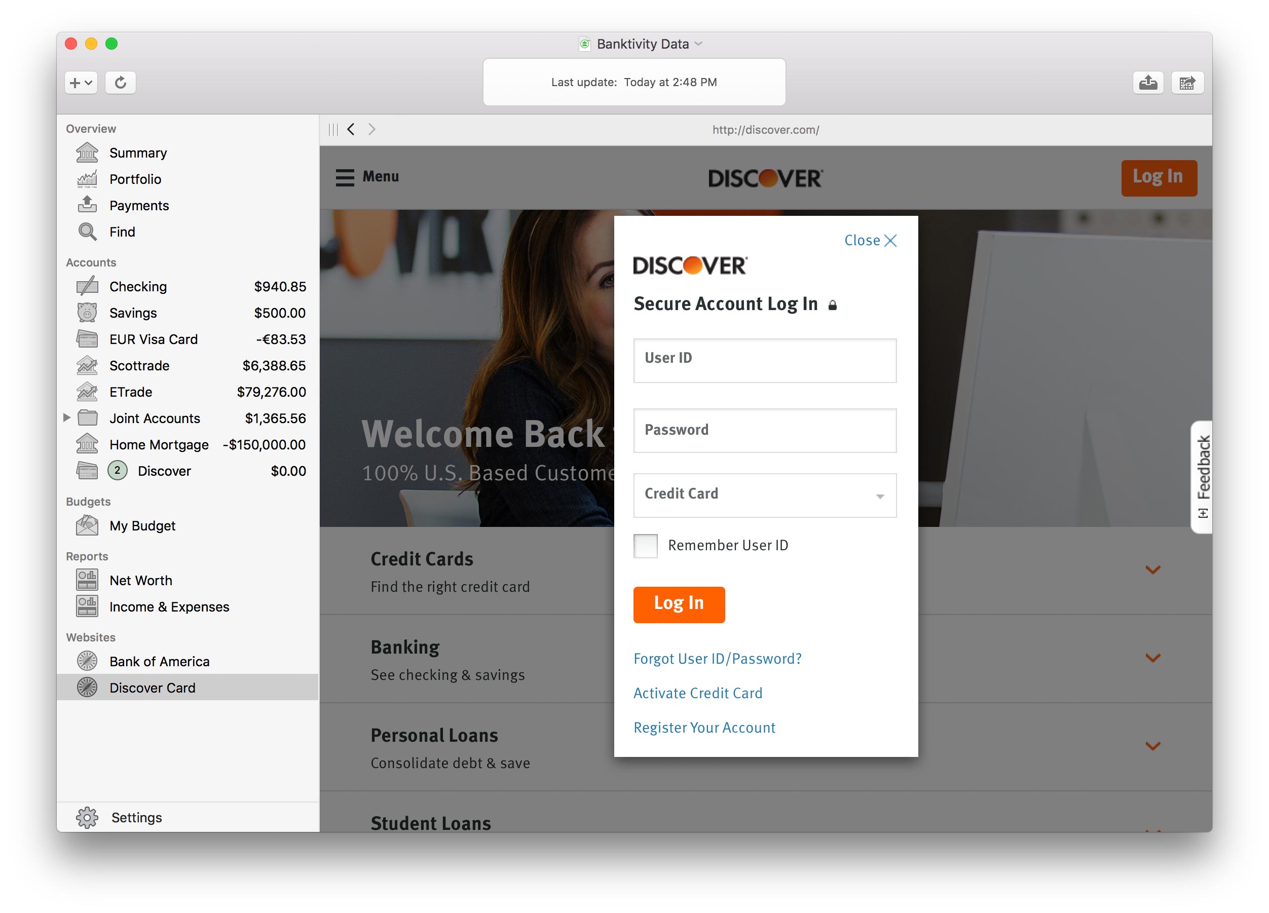 When you are finished downloading transactions from your financial institution, be sure to log out of your account, then select an account (or any other item) in Banktivity's sidebar to leave the browser.