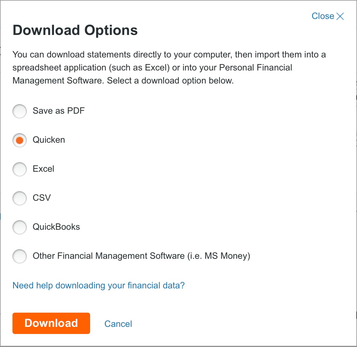 If the OFX or QFX file format is available, choose one of those options as they contain the most comprehensive transaction data. If neither of those are available, choose QIF or CSV format.