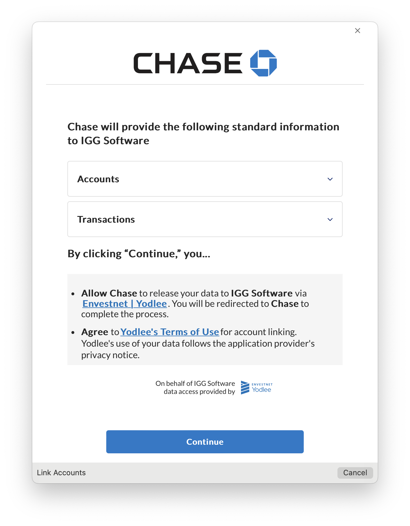 When you choose Continue, you will open a new web browser window on your device using your default browser. This page will be a direct link to your bank that will ask you to log in and confirm that you give IGG Software access to certain information for your accounts. This connection method is more reliable and secure than banks that do not offer Open Banking at this time, see Security & Privacy.
