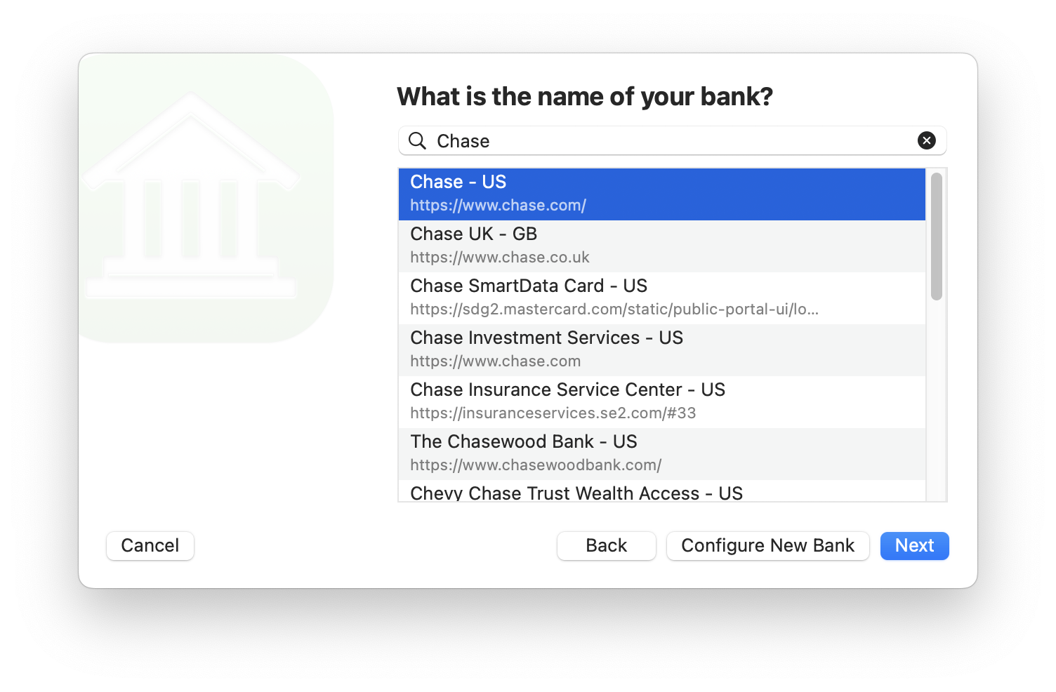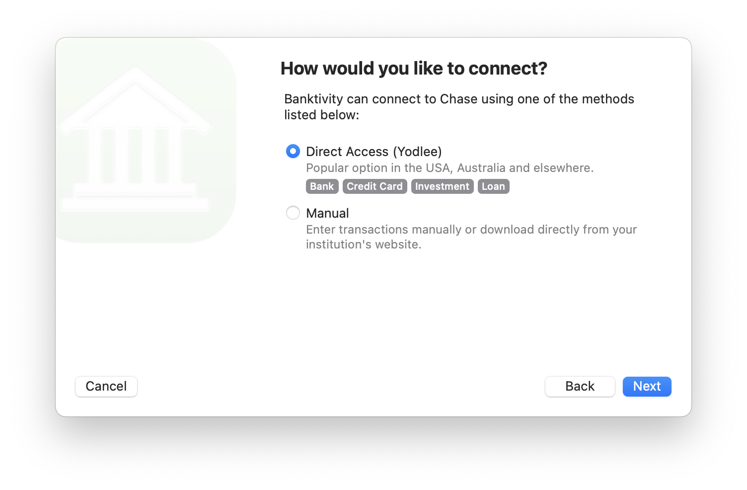 Once you choose an institution, Banktivity will ask the servers at IGG Software what types of connections are currently available for your selection. If Direct Access is listed, select it and click "Next" to continue. If you do not see Direct Access as one of the available choices, then your financial institution is not currently supported and you will need to proceed with one of the other options.
