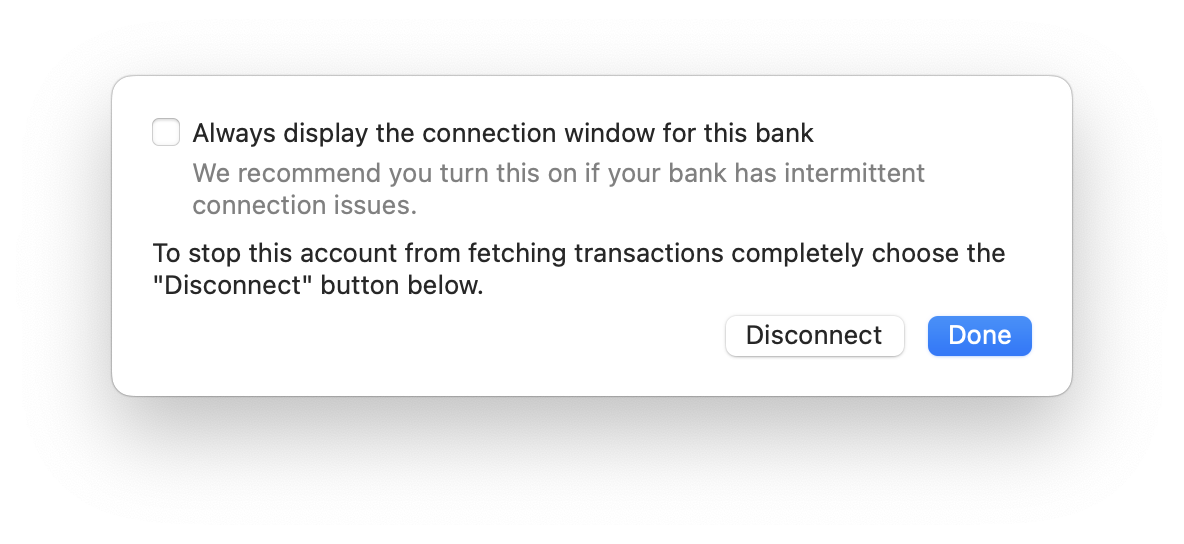 The account will no longer be connected to an online institution and will need to be updated manually from that point forward. If you want to re-enable online access in the future, select the account and choose Account > Set Up Automatic Downloads.