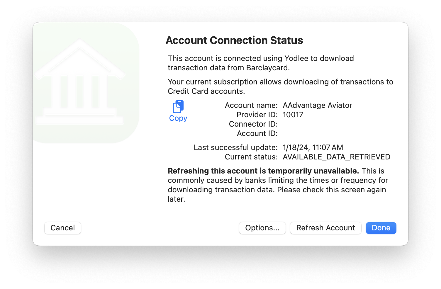 If there is a problem with the online connection, this screen will show details about the problem and how to resolve it. To refresh the connection to an online account, click "Refresh Account." If the account login details have changed, you will be prompted to enter them again.